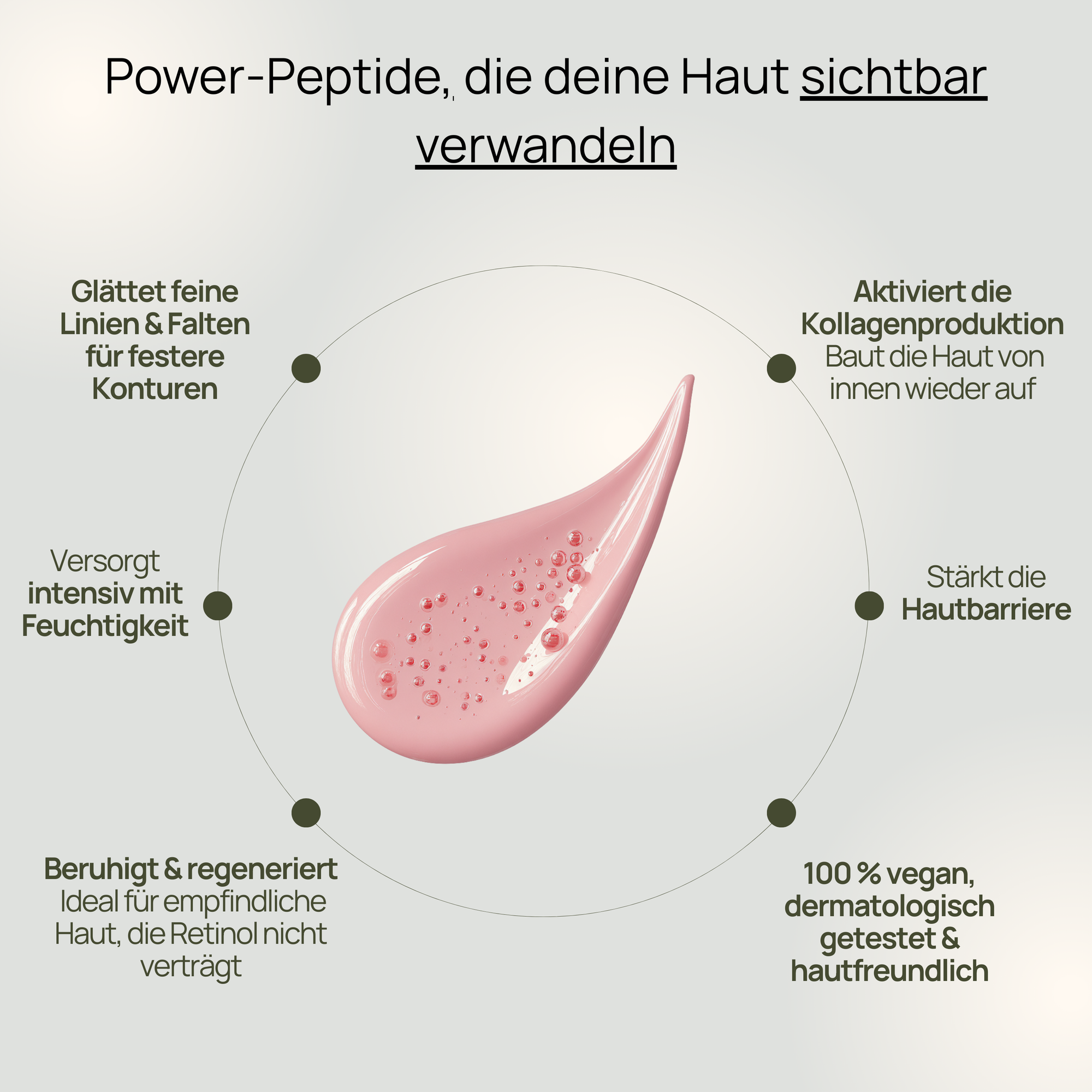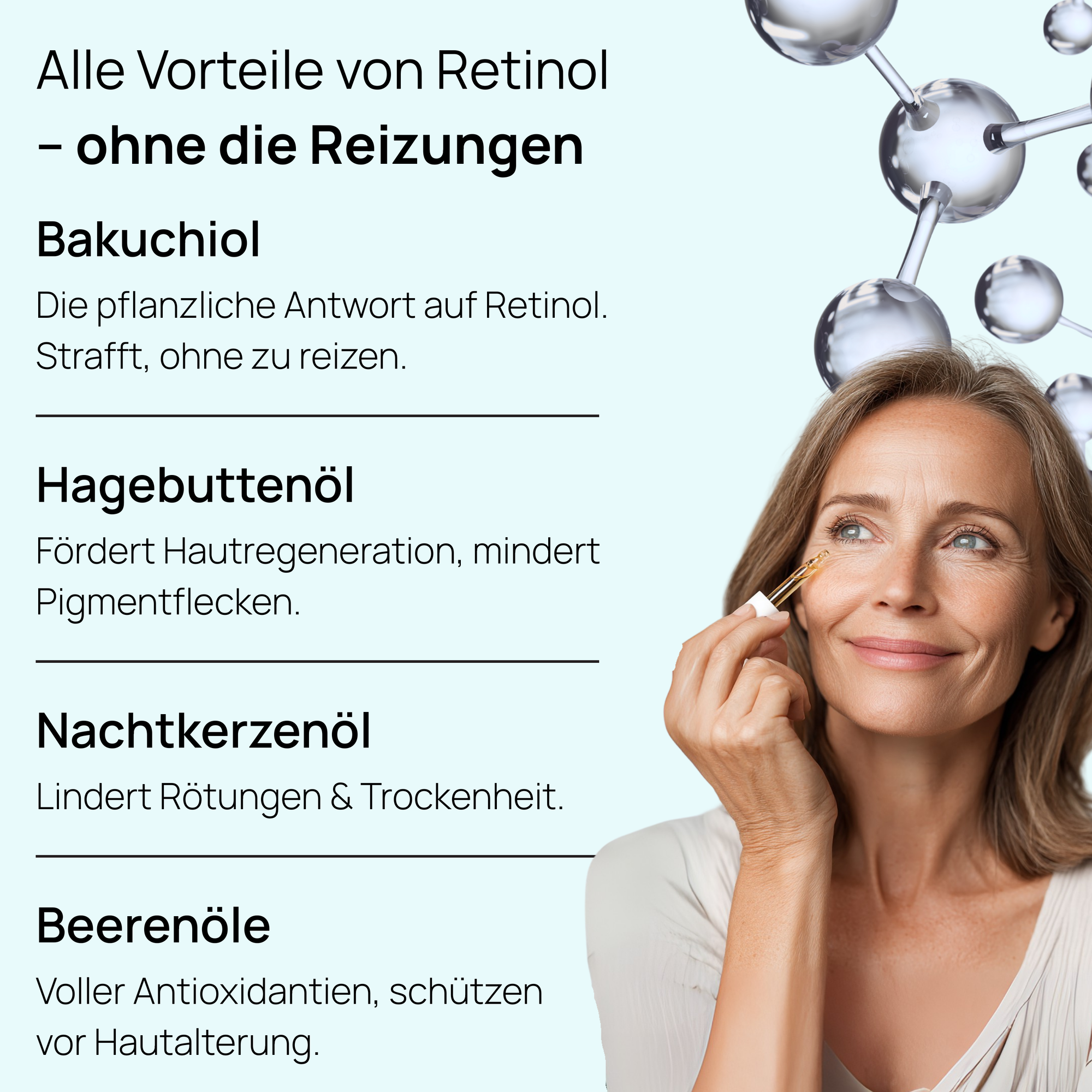 Wir verzichten bewusst auf aggressive Stoffe wie klassisches Retinol oder harte Chemikalien. Stattdessen setzen wir auf klinisch geprüfte Pflanzenwirkstoffe (z. B. Bakuchiol, Vitamin C, Ceramide), die die Haut sichtbar verbessern – sanft, nachhaltig und ohne Nebenwirkungen.
