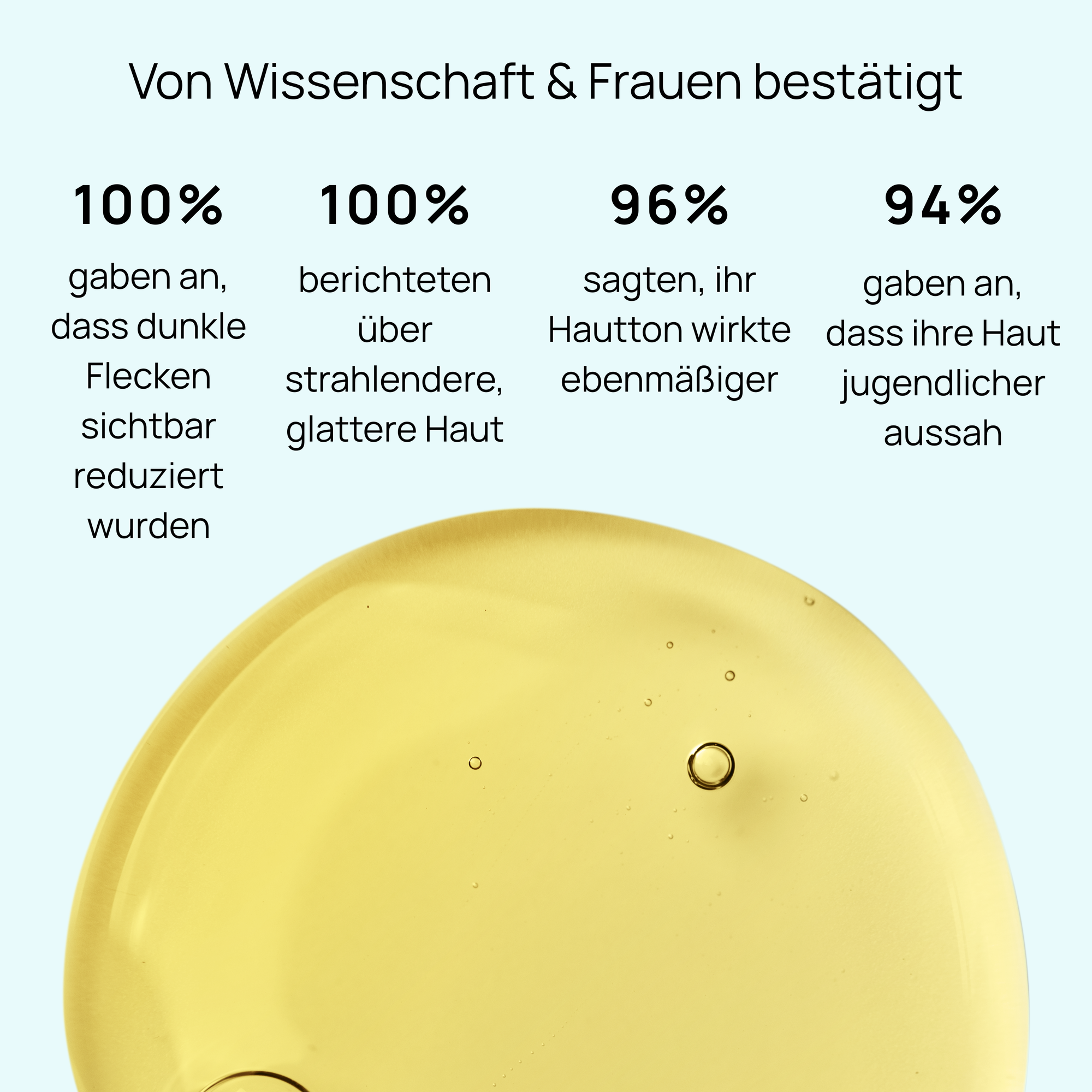 Viele Kundinnen berichten von sichtbarer Veränderung bereits nach 3–4 Wochen. Für die besten Ergebnisse empfehlen wir eine regelmäßige Anwendung über mindestens 8–12 Wochen.