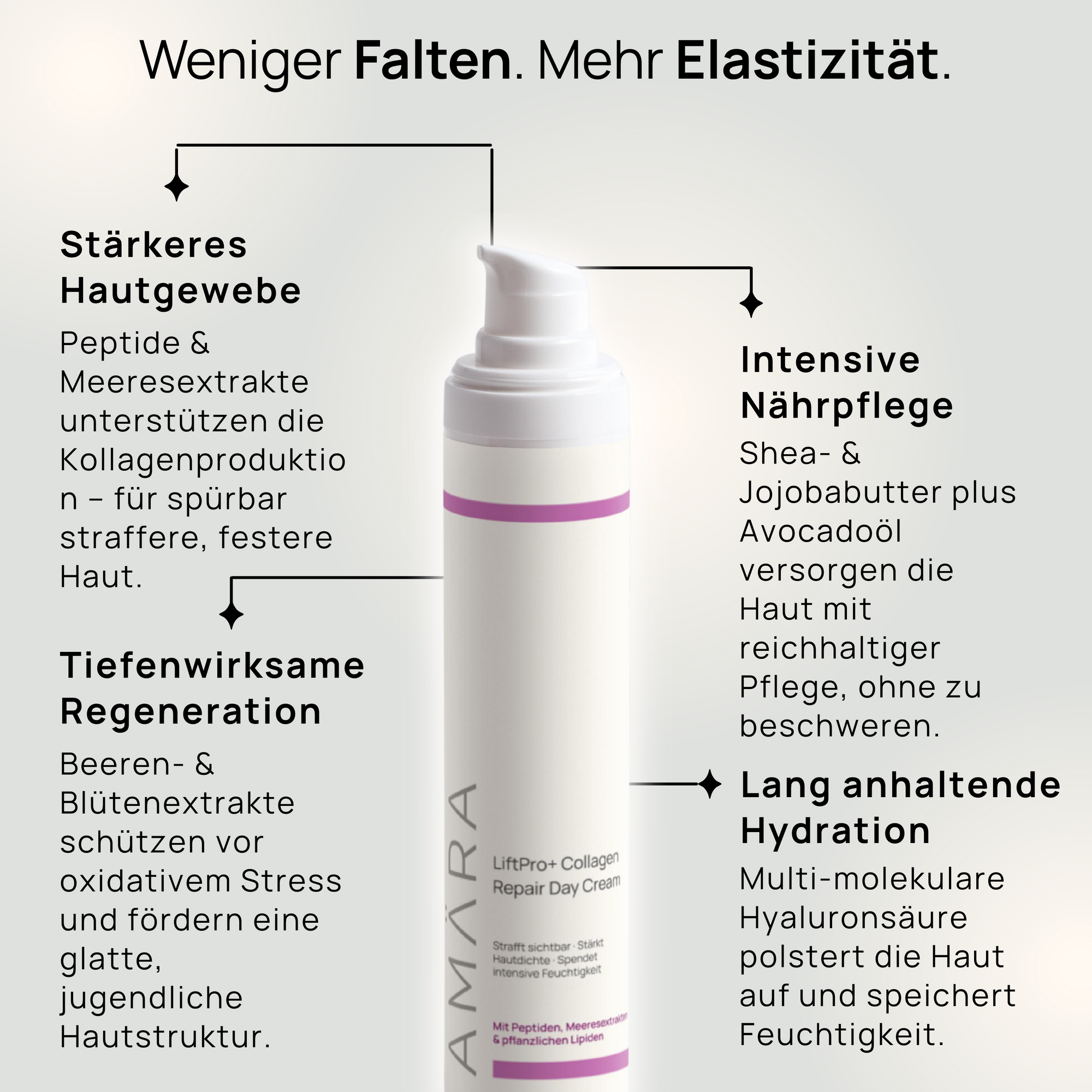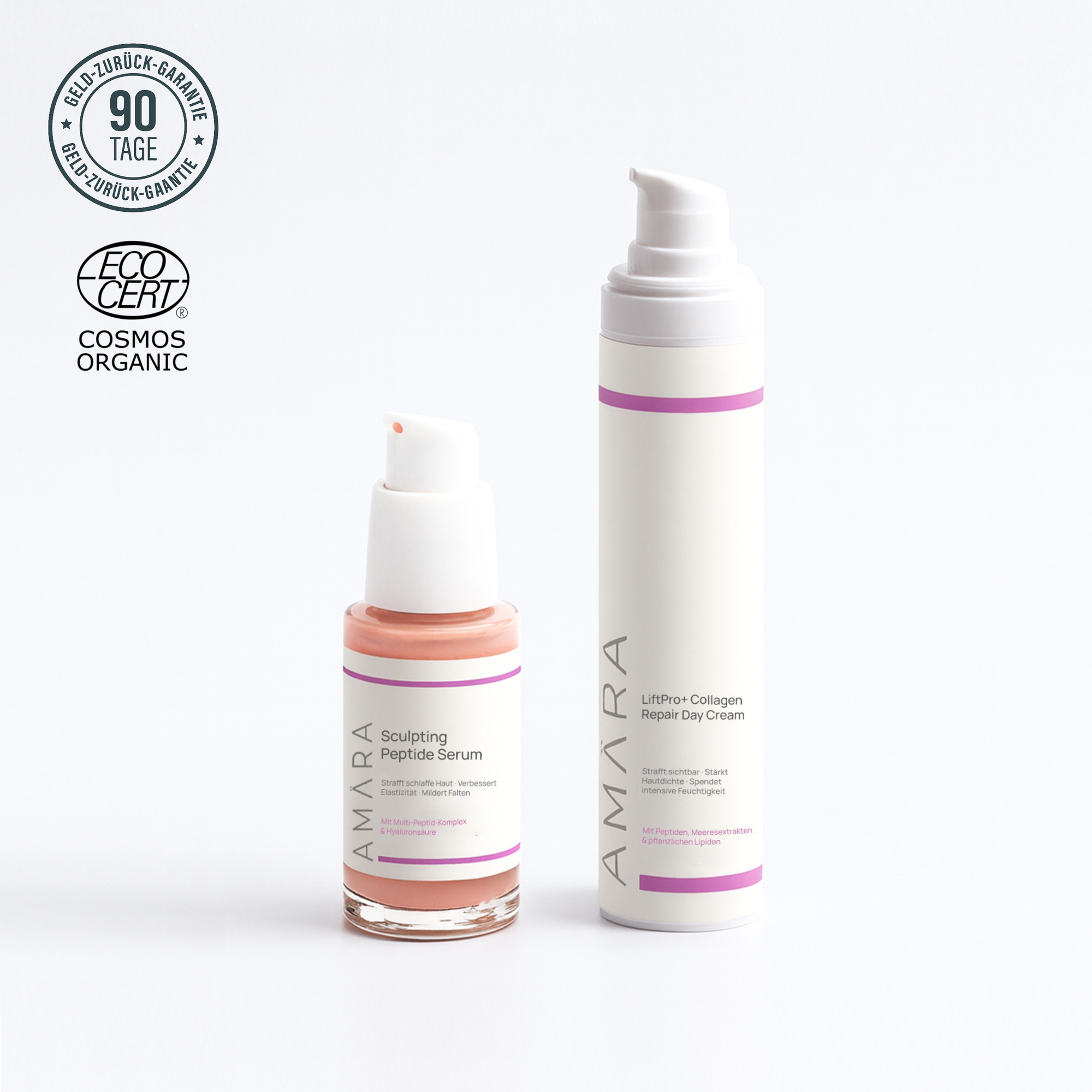 Falten, Spannkraftverlust, müde Haut? Peptide können genau das sein, was deiner Haut fehlt. Entdecke, wie Amaras Sculpting Serum & LiftPro+ Creme die Haut straffen, schützen...